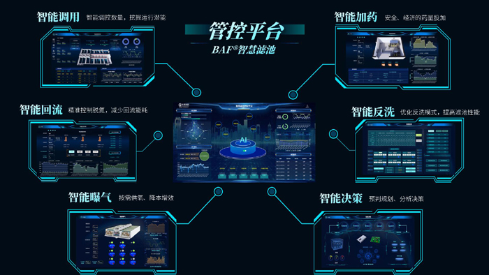 BAF智慧濾池?fù)碛兄悄苷{(diào)用、智能回流、智能反洗、智能加藥、智能曝氣、智能決策六大板塊,六駕“馬車”齊發(fā)力,充分發(fā)揮AI 人工智能在水廠運(yùn)營中的有力作用。智能調(diào)用系統(tǒng)自動(dòng)計(jì)算濾池運(yùn)行數(shù)量,根據(jù)用戶需求交替啟用,確保冬季低溫下出水水質(zhì)穩(wěn)定達(dá)標(biāo),同時(shí)降低曝氣能耗;智能回流系統(tǒng)實(shí)時(shí)調(diào)控回流比,解決了硝化液回流過量的問題,確保濾池精準(zhǔn)脫氮,大幅節(jié)省電耗;針對(duì)不同功能的濾池,智能反洗系統(tǒng)通過選用循環(huán)洗、降水位反沖洗、強(qiáng)制反洗等模式,提高反洗效率,降低反洗頻次,節(jié)省電耗;智能加藥系統(tǒng)結(jié)合進(jìn)水水質(zhì)水量,AI智能投加反硝化碳源,確??偟_(dá)標(biāo)的前提下大幅度降低藥耗;智能曝氣系統(tǒng)充分考慮氣泡經(jīng)濾料剪切帶來溶解氧升高的影響,實(shí)現(xiàn)按需供氧,降低曝氣能耗;智能決策系統(tǒng)根據(jù)運(yùn)營需求,對(duì)不同控制模塊的經(jīng)濟(jì)性、安全性、穩(wěn)定性進(jìn)行綜合比選,制定精準(zhǔn)、有效的控制方案。