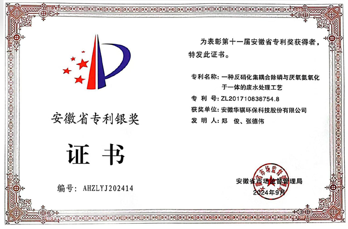 9月3日,安徽省市場(chǎng)監(jiān)督管理局(安徽省知識(shí)產(chǎn)權(quán)局)公示了第十一屆安徽省專利獎(jiǎng)評(píng)選結(jié)果。華騏環(huán)?!耙环N反硝化集耦合除磷與厭氧氨氧化于一體的廢水處理工藝”發(fā)明專利榮獲安徽省專利銀獎(jiǎng)。