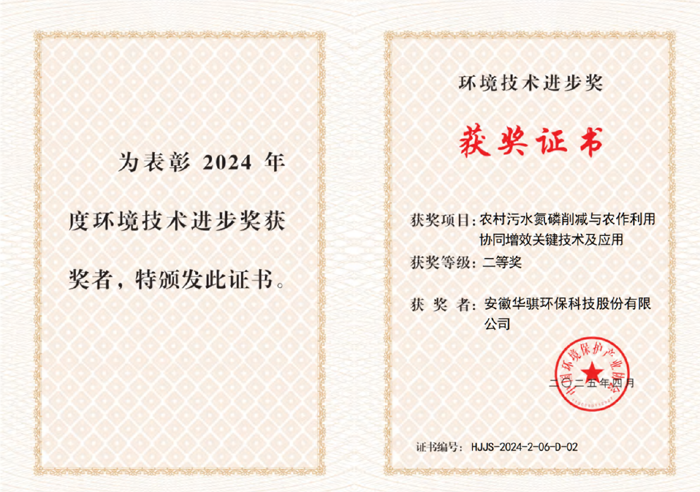 2025年4月,由安徽華騏環(huán)保科技股份有限公司與安徽農(nóng)業(yè)大學聯(lián)合申報的《農(nóng)村污水氮磷削減與農(nóng)作利用協(xié)同增效關(guān)鍵技術(shù)及應(yīng)用》項目,榮獲中國環(huán)境保護產(chǎn)業(yè)協(xié)會頒發(fā)的2024年度“環(huán)境技術(shù)進步獎”二等獎。這項科研成果,成功破解了農(nóng)村污水處理與農(nóng)業(yè)資源化利用的協(xié)同發(fā)展難題,為我國鄉(xiāng)村振興戰(zhàn)略中的生態(tài)治理提供了創(chuàng)新性解決方案。