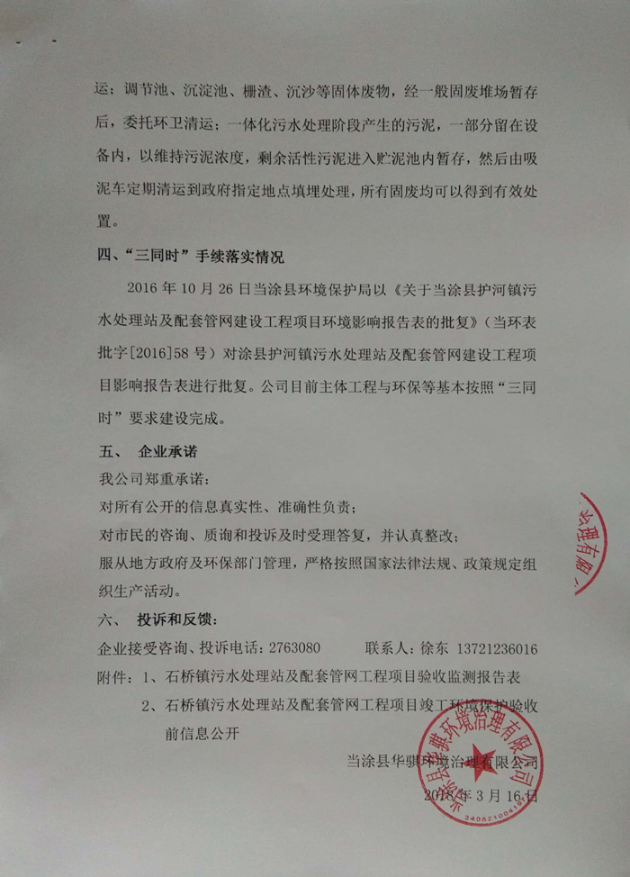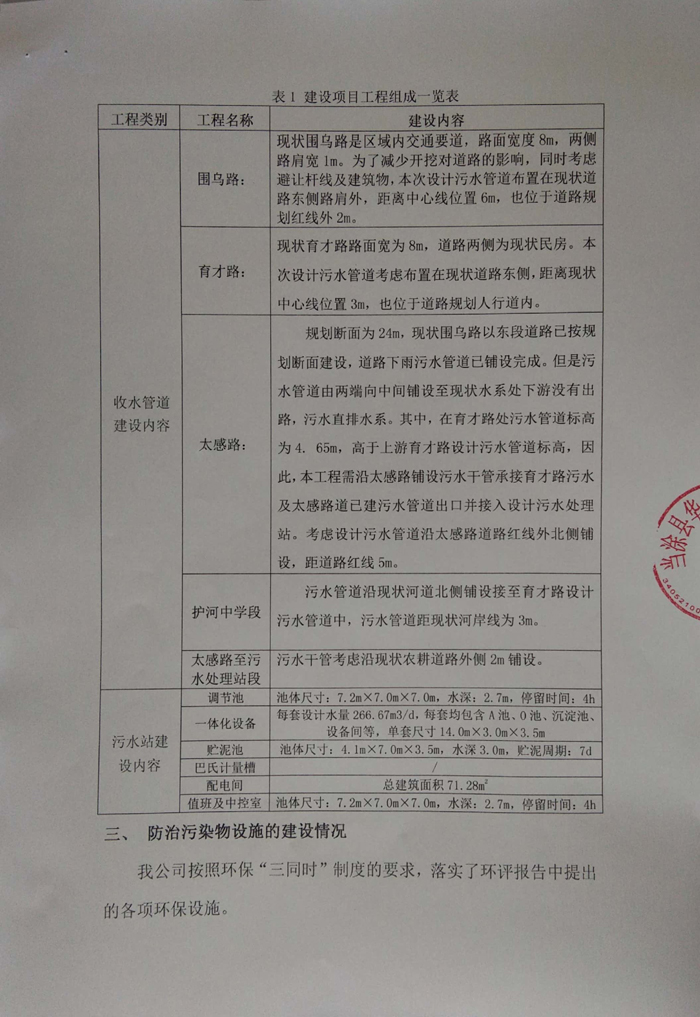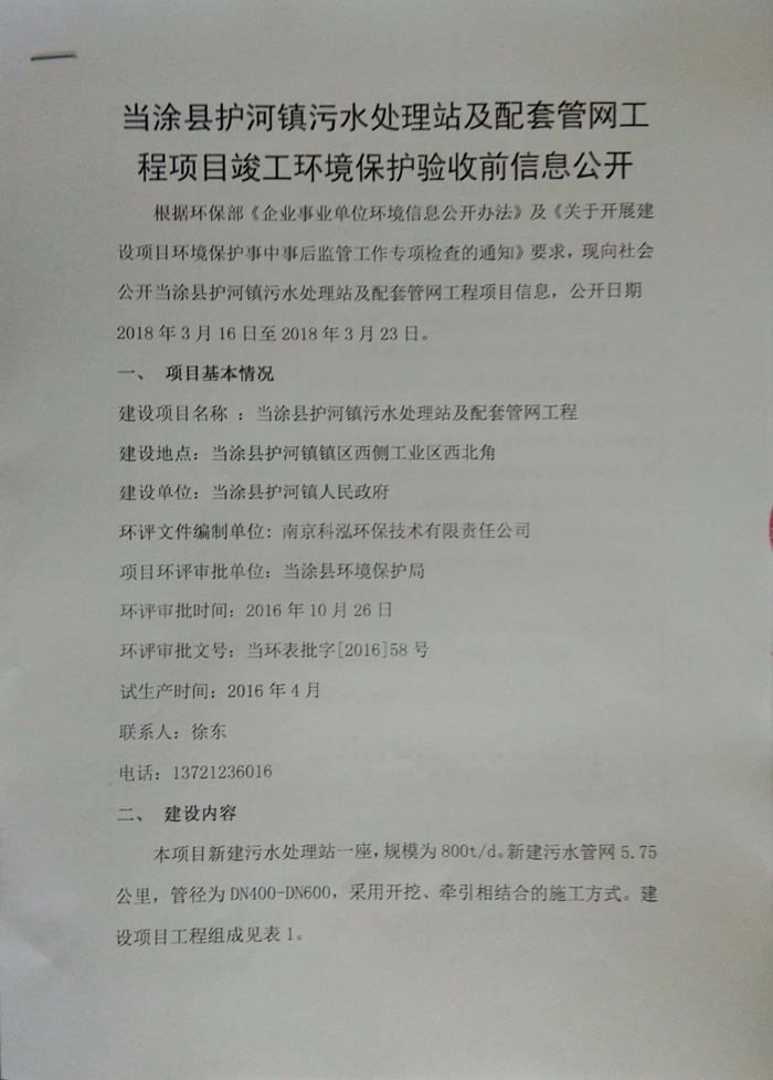 2016年10月26日當(dāng)涂縣環(huán)境保護(hù)局以《關(guān)于當(dāng)涂縣護(hù)河鎮(zhèn)污水處理站及配套管網(wǎng)建設(shè)工程項(xiàng)目環(huán)境影響報(bào)告表的批復(fù)》(當(dāng)環(huán)表批字[2016]58號(hào))對(duì)涂縣護(hù)河鎮(zhèn)污水處理站及配套管網(wǎng)建設(shè)工程項(xiàng)目影響報(bào)告表進(jìn)行批復(fù)。公司目前主體工程與環(huán)保等基本按照“三同時(shí)”要求建設(shè)完成。