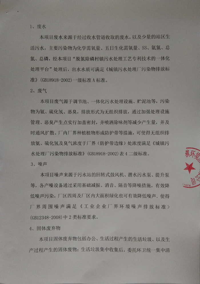 本項(xiàng)目廢水來源于經(jīng)過收水管道收取的廢水,以及少量的站區(qū)生活污水,主要污染物為化學(xué)需氧量、五日生化需氧量、SS、氨氮、總氮、總磷,經(jīng)本項(xiàng)目“脫氮除磷村鎮(zhèn)污水處理工藝專利技術(shù)的一體化處理平臺(tái)”處理后,出水水質(zhì)可滿足《城鎮(zhèn)污水處理廠污染物排放標(biāo)準(zhǔn)》(GB18918-2002)一級(jí)標(biāo)準(zhǔn)A標(biāo)準(zhǔn)。