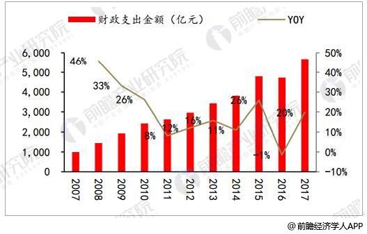 2007-2017年全國環(huán)保行業(yè)財政支出金額及增長情況