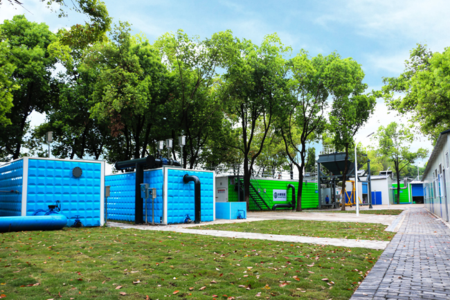 西李郢站區(qū)選址于西李郢排澇泵站東側(cè)綠地,實(shí)際占地約4480㎡,設(shè)計(jì)處理能力10000m3/d,采用我司研發(fā)的Rapid-Move®黑臭水體旁路處理系統(tǒng)——“邁巴睿?(MBBR系統(tǒng))+魔方磁®(磁混凝系統(tǒng))+魔方尊®(BAF系統(tǒng))”組合工藝產(chǎn)品。進(jìn)水從西李郢排澇泵站前端截流井取水或新建雨水調(diào)蓄池泵提取水,當(dāng)水量不足時(shí),從巢湖南路DN1000污水管道泵提取水,出水通過(guò)現(xiàn)狀雨水排口排入南淝河。