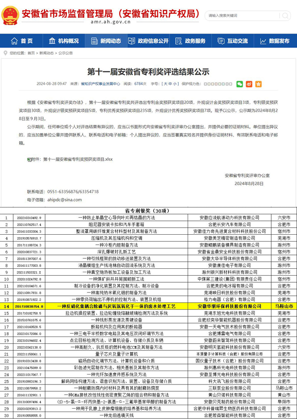 近日,安徽省市場監(jiān)督管理局(安徽省知識產(chǎn)權(quán)局)公示了第十一屆安徽省專利獎評選結(jié)果。安徽華騏環(huán)保科技股份有限公司“一種反硝化集耦合除磷與厭氧氨氧化于一體的廢水處理工藝”發(fā)明專利榮獲安徽省專利銀獎。